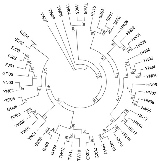 The genetic split between different populations was also discerned by PCA in Figure 4. Separation along the first discriminant function (PC1) shows that all accessions are divided into two populations, Hainan population and no-Hainan population, which is consistent with the K = 2 analysis of population structure analysis and indicates the distinct genetic distance between accessions from Hainan and Taiwan. PC2 shows no-Hainan population differentiated into several subgroups. It was consistent with the results of the population structure as shown above.