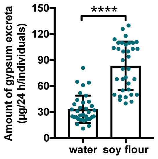 Quantification of gypsum excreta from Tribolium castaneum. Thirty-five beetles were examined in this assay for each treatment. The gypsum feces excreted by individual beetles within a 24 h period were weighed using a microbalance (green dots). Statistical significance was determined using the Mann–Whitney U test (**** p < 0.0001). Each statistical value is shown in Supplemental data. Error bars represent S.D. Water: the adults were fed gypsum supplemented with water as the control. Soy flour: the adults were fed gypsum supplemented with soy flour.