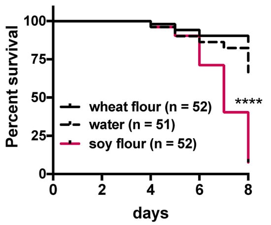 Survival of Tribolium castaneum adults fed a gypsum diet supplemented with soy flour. Each beetle was fed a gypsum diet supplemented with either wheat flour, water (control), or soy flour. The effects of the supplements on the lifespan of T. castaneum adults were assessed using the survival rate of female adult beetles. Statistical significance was determined using the log-rank (Mantel–Cox) test (**** p < 0.0001) and the Gehan–Breslow–Wilcoxon test. Each statistical value is shown in Supplemental data.