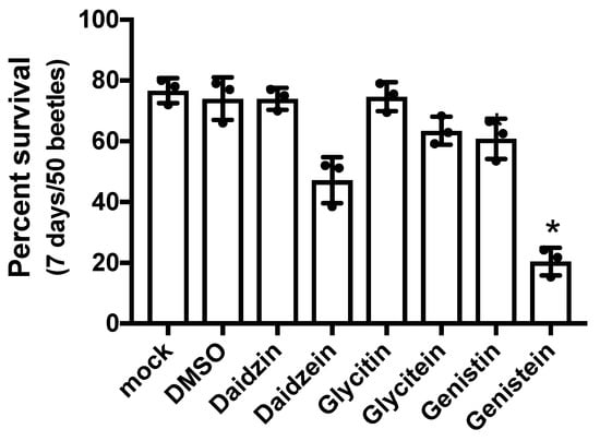 The present study assessed the effect of isoflavones, such as daidzin, daidzein, glycitin, glycitein, genistin, and genistein, on T. castaneum beetles by TribUTE assay (Figure 3). Daidzin, glycitin, glycitein, and genistin were not found to have lethal effects on the beetles. Daidzein had a minor lethal effect. The survival rates of beetles significantly decreased in the presence of 20 µM genistein and genistin (Figure 3). Genistein, a major flavonoid in soy flour, greatly affected T. castaneum; however, the assessment of its effects required the monitoring of the survival rates of female adults for 7 days after exposure. In addition, genistein did not appear to have a lethal effect for a short period of time (data not shown). Therefore, it was difficult to identify the effects by isoflavones, including genistein, using the TribUTE assay.