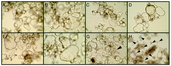 Cytotoxicity of Tc81 cultured cells by isoflavones after exposure for 24 h. The Tc81 cells were exposed to 20 µM of the different isoflavones in the culture medium. (A) mock (control); (B) DMSO; (C) Daidzin; (D) Daidzein; (E) Glycitin; (F) Glycitein; (G) Genistin; (H) Genistein. Scale bars represent 200 µm. Arrows (black) indicate shrunken cells.