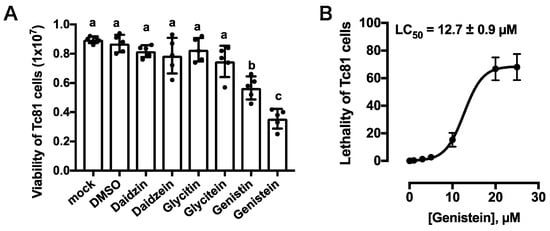 Cytotoxicity of Tc81 cells in the presence of isoflavones. (A) The survival of Tc81 cells was examined at 24 h after exposure. Cell viability was evaluated using 24-microwell plates, and each dot represents an individual well. Statistical significance was determined using the Kruskal–Wallis test (*** p = 0.0003) and Dunn’s multiple comparisons test. Same letters indicate non-significance. Each statistical value is shown in Supplemental data. (B) Lethal concentration response assessment of Tc81 cells against genistein. The lethality was examined at 24 h after exposure. Error bars represent S.E.