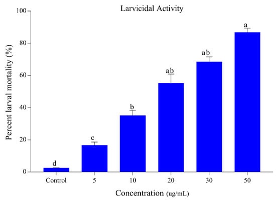 Percentage mortality of Ae. albopictus third-instar larvae following S. alopecuroides extract treatment at different concentrations. Blue bars represent the mortality of Ae. albopictus third-instar larvae after exposure to different concentrations (5, 10, 20, 30, and 50 ug/mL) of S. alopecuroides (SACE) extract. Error bars show 95% confidence intervals (CIs). Different letters indicate significant differences at p < 0.05.
