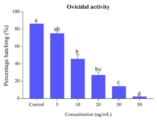 Percentage of Ae. albopictus eggs hatching when S. alopecuroides extracts treated at different concentrations. Blue bars represent the egg hatching percentage of Ae. albopictus third-instar larvae after exposure to different concentrations (5, 10, 20, 30, and 50 ug/mL) of S. alopecuroides (SACE) extract. Error bars show 95% confidence intervals (CIs). Different letters indicate significant differences at p < 0.05.