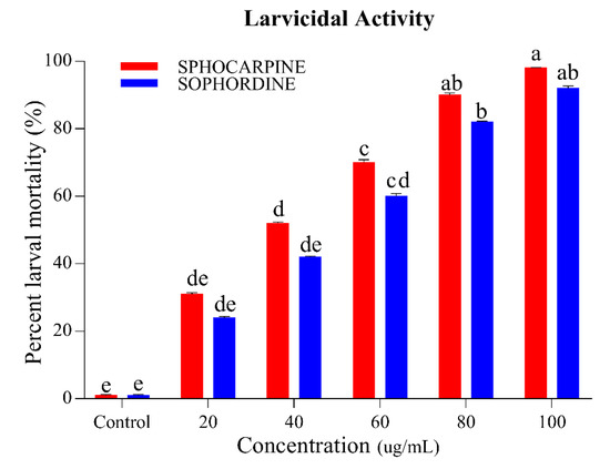 Percentage of larval mortality of Ae. albopictus (third-instar larvae) when Sophocarpin and Sophordine were applied at different concentrations (20, 40, 60, 80, and 100 ug/mL). Red bar indicates larval mortality due to Sophocarpin and blue bars represent larval mortality percentage of Sophordine. Error bars show 95% confidence intervals (CIs). Different letters indicate significant differences at p < 0.05.