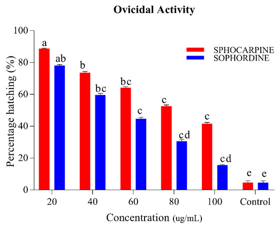 Percentage of Ae. albopictus eggs hatching when Sophocarpin and Sophordine were treated at different concentrations (20, 40, 60, 80, and 100 ug/mL). The red bar shows the percent hatching of Sophocarpin, while the blue bars represents the egg hatching percentage of Sophordin of S. alopecuroides (SACE) extract. Error bars show 95% confidence intervals (CIs). Different letters indicate significant differences at p < 0.05.