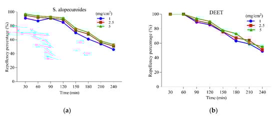 The results of the repellent activity of S. alopecuroides extract, along with positive control (DEET), against the adult female Ae. albopictus are presented in Figure 5. Our results displayed a direct relationship between repellent activity and different concentrations of the extract, while an inverse relationship was observed with the time of application. The results of repellent activity demonstrate that S. alopecuroides extract resulted in 93.11% protection for 90 min, which kept reducing with time and, at 240 min, only 53.14% protection was provided at a 5 mg/cm2 concentration (Figure 5a). However, the positive control (DEET) also provided protection percentage (94.18%) in the first 90 min and 55.33% in 240 min at a 5 mg/cm2 concentration (Figure 5b).