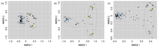 Nonmetric multidimensional scaling of (a) bacterial, (b) fungal, and (c) overall microbial community compositions of pollen provisions from Source K (green circles), and Source B (blue circles). Points that are close together are more similar in diversity and abundance to one another than points that are far apart. Each black circle represents a unique microbial taxon.