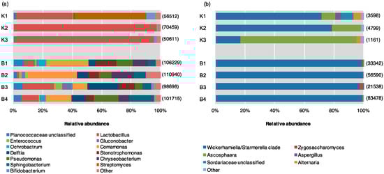 Relative abundance of (a) bacterial and (b) fungal genera within pollen provisions of indoor–reared bumble bee colonies from Source K (N = 3), and Source B (N = 4). Sequences belonging to different microbial genera are shown in different colors. The total number of sequences isolated is displayed to the right of each library.