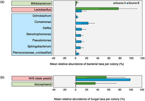 Bacteria detected from pollen provisions included members of four phyla (Firmicutes, Proteobacteria, Bacteroidetes, Actinobacteria). Source K had higher abundance of Firmicutes, mainly belonging to the genus Lactobacillus. Actinobacteria included genera Streptomyces and Bifidobacterium, while there were minimal contributions from Proteobacteria and Bacteroidetes. In contrast, Source B had greater abundance of Proteobacteria (genera Ochrobactrum within Alphaproteobacteria, Comamonas and Delftia within Betaproteobacteria, and Stenotrophomonas and Pseudomonas within Gammaproteobacteria), and Bacteroidetes (Chryseobacterium and Sphingobacterium). While there was a lower abundance of Lactobacillus compared to Source K, Source B included other Firmicutes, including Enterococcus and an unclassified member within the Planococcaceae family (Figure 2a, Supplementary Material, Table S3).
