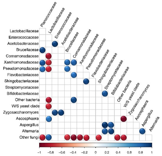 Microbial OTUs that showed > 50% prevalence and > 1% relative abundance across all replicates within each source were assigned as “core microbiota” [79]. This cut off criterion was chosen based on previous work [79] and did not represent an established biological parameter. Based on this characterization, the core microbiota of Source K included two fungal and two bacterial taxa, whereas that of Source B consisted of one fungal and eight bacterial taxa. The shared core microbiota between the two sources consisted of only two groups, Lactobacillus and W/S clade yeasts (Figure 3). Pearson correlation analysis revealed significant associations between the relative abundance of multiple pairs of microbial taxa across all hives (Figure 4). Of these, the strongest positive correlations were detected between Enterococcaceae and Acetobacteraceae (r = 0.956, p < 0.001), Zygosaccharomyces and Acetobacteraceae (r = 0.959, p < 0.001), and Streptomycetaceae and Aspergillus (r = 0.995, p < 0.001). The strongest negative correlations were detected between W/S clade yeasts and Ascosphaera (r = −0.974, p < 0.001), and Lactobacillaceae and Comamonadaceae (r = −0.867, p < 0.01).
