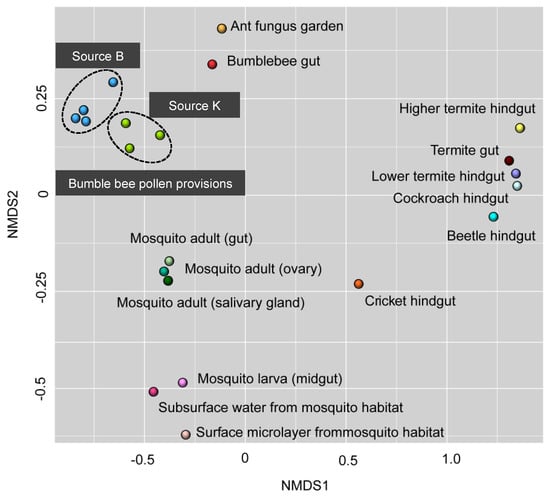Bacterial, fungal, and overall microbial community structure was visualized using nonmetric multidimensional scaling (NMDS) of the Bray-Curtis dissimilarity coefficient [76]. The generalized and variance-adjusted weighted Unifrac distances between each library were calculated using the R package GUNIFRAC [77], and the PermanovaG function of the same package was used to determine the differences in the fungal and bacterial communities between the two commercial sources. Shannon’s diversity and Pielou’s evenness metrics were computed and compared using the R package Vegan [78]. Microbial OTUs that showed > 50% prevalence and > 1% relative abundance across all replicates within each source were assigned as “core microbiota” [79]. The strength of association between the relative abundance of microbial taxa present in all hives was calculated by Pearson correlation analysis using the corrplot package in R [80]. The bacterial community of bumble bee pollen provisions reported in this study was compared to publicly available data from other insect–microbe symbioses that also amplified the V3/V4 regions of the 16S rRNA gene [34,81,82,83,84]. Clustering of bacterial communities from all selected studies was visualized by NMDS analysis based on the proportions table using the metaMDS function in the R package Vegan.