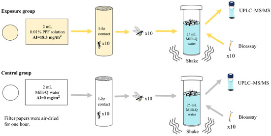 Two milliliters of 0.01% w/w PPF solution (manufactured by Chung Hsi Chemical Plant, Taipei, Taiwan) was evenly sprayed on 3M filter paper as the exposure group. The control filter paper was sprayed with 2 mL of Milli-Q water. The active ingredient (AI) of PPF on the filter paper of the exposure group was 18.3 mg/m2. The filter papers were ventilated for one hour to dry and then used to encircle the inner surface of the plastic cylinder tube. Ten laboratory-reared female adult Ae. aegypti mosquitoes were kept in the tube in contact with the filter paper for one hour and transferred to another tube containing 25 mL of Milli-Q water. Ten exposed mosquitoes were shaken gently with 25 mL of Milli-Q water for three minutes to simulate the maximum dose of PPF per mosquito to disseminate into a small amount of water. Five milliliters of the above water sample was taken for quantitation of PPF using UPLC–MS/MS. The remaining 20 mL water sample was used for the mosquito bioassay. The exposure experiment was repeated three times. The experimental diagram is shown in Figure 1.