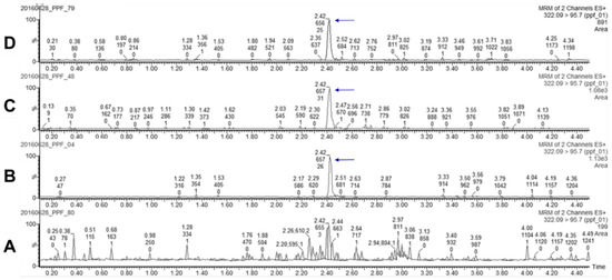UPLC–MS/MS multiple-reaction monitoring (MRM) chromatograms of (A) PPF-untreated control, (B) 16 ng/L of PPF standard, (C) laboratory water sample from PPF exposure group, and (D) field water sample with EI 100%. The PPF peak appeared at 2.42 min (arrow, retention time) with response of ≈1000 in the PPF standard (16 ng/L) and in lab and field water samples with EI 100%.