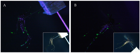 Mosquito of Ae. aegypti showed contamination as fluorescence under UVA light (365 nm), showing that mosquitoes carry and disseminate PPF primarily through abdominal and tarsal contact. (A) lateral view; (B) abdominal view.