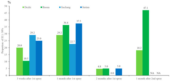 There were 97, 95, 86, and 39 water samples collected from the sentinel ovitraps from the first to fourth collection, respectively. The overall proportions of sentinel ovitraps containing mosquito eggs, mosquito larvae, dead mosquito adults, and dead bodies of other creatures (including moth fly, fruit fly, nonbiting midge, ant, spider, weevil, and snail) were 10.7% (34/317), 2.8% (9/317), 0.9% (3/317), and 38.8% (123/317), respectively. There was no EI or PPF detected from the three control sentinel ovitraps in Baoshi Li throughout the field trial. The proportion of sentinel ovitraps reaching EI ≥ 50% in the four Li at four collection time points is shown in Figure 5. There were no significant spatial differences in EI% among districts (χ2 = 0.15, d.f. = 1, p = 0.70), Li (χ2 = 0.25, d.f. = 3, p = 0.97), and indoor/outdoor microhabitats (χ2 = 1.53, d.f. = 6, p = 0.96), but significant temporal differences (χ2 = 54.80, d.f. = 3, p < 0.001) were observed among the four collection time points. Within one month post-spraying, an average of 27.6% (range = 10.5%–47.1%) of the sentinel ovitraps reached EI ≥ 50%. This effect significantly decreased two months after spraying, at which the proportion with EI ≥ 50% was only 0%–5% in the third collection.