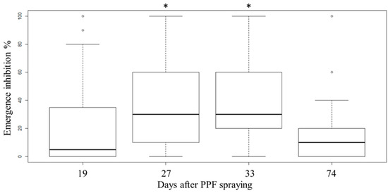 Box plot of EI% in sentinel ovitraps at 19, 27, 33, and 74 days after PPF spraying. Multiple comparison of EI% showed that after one month (27 and 33 days, median = 30%) the value was significantly higher (adjusted p-value ≤ 0.002, labelled with *) than those after three weeks (19 days, median = 5%) and after two months (74 days, median = 10%) by the Bonferroni correction for post-hoc Dunn’s pairwise tests.