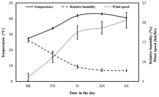 Hourly average values of weather factors during times in the day during the Acacia gerrardii flow (May-August) in Central Arabia for the 2017 and 2018 seasons (SR: sunrise; FN: forenoon; N: noon; AN: afternoon; SS: sunset).