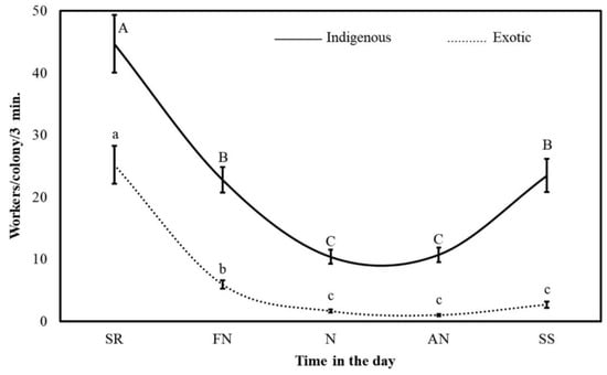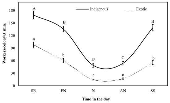 The outgoing foraging rates of all colonies in the two subspecies showed clear hourly variations during the Acacia flow. The maximum and minimum foraging rates occurred during the SR and N times, respectively. The foraging rate at SR was 4.2 and 3.8 times greater than that during N and AN, respectively. The colonies performed 33.7%, 24.7%, 8.1%, 9.0% and 24.5% of their daily foraging trips during the SR, FN, N, AN, and SS times, respectively. The peak foraging activity of the native bee colonies occurred at SR (169 ± 9 workers/colony/3 min), while their lowest foraging rate occurred at N (49 ± 5 workers/colony/3 min). Furthermore, the foraging rate of the native colonies at SR was 1.2, 3.4, 3.1 and 1.2 times greater than the foraging rates at FN, N, AN and SS, respectively. These colonies performed 30.9%, 24.8%, 9.0%, 9.9% and 25.4% of their daily foraging flights at SR, FN, N, AN, and SS, respectively (Figure 3).