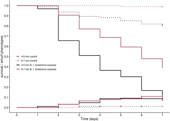 Figure 3. Survival and occurrence of Smurf phenotype in small and large larvae of T. molitor during exposure to B. thuringiensis tenebrionis. Kaplan-Meier curves representing the survival (descending curves) and the cumulative incidence of Smurf phenotypes (ascending curves) in T. molitor larvae of 4–5 mm (in pink) or larvae of 6–7 mm (in black) when exposed to a control diet (dashed lines) or 2.5 × 109 CFU/mL of B. thuringiensis var. tenebrionis spores and crystals mix (plain lines). Data in Table S1.