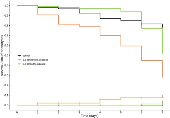 Figure 5. Survival and occurrence of Smurf phenotype in 15-day-old T. castaneum larvae exposed to Bacillus thuringiensis var. tolworthi and B. thuringiensis var. tenebrionis. Kaplan–Meier curves representing the survival (descending lines) and the cumulative incidence of Smurf phenotypes (ascending lines) in 15-days-old T. castaneum larvae exposed to a control diet (in black), 2.5 × 109 CFU/mL of B. thuringiensis var. tenebrionis (in orange) and 2.5 × 109 CFU/mL of B. thuringiensis var. tolworthi (in green) spores and crystals mix. Data in Table S2.