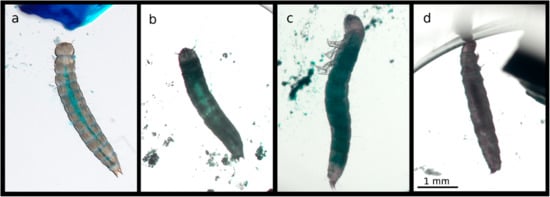 Similarly to what we observed in exposed T. molitor larvae, the occurrence of the Smurf phenotype did not exceed 10% for both bacterial treatments. It was not affected by the exposure treatment (treatment: X23,280 = 2.82; p = 0.25). The most often observed phenotype was a darkened digestive tract, which was present in live moribund larvae as well as in dead ones (Figure 6).