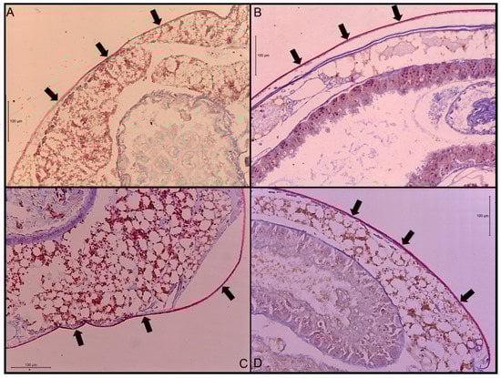 Transverse sections of stained abdominal cuticle at 200× magnification. (A) Co. formosanus; (B) N. jouteli; (C) C. cavifrons; (D) C. brevis. The arrows indicate the cuticle.