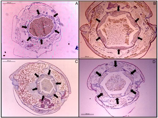 Transverse sections of stained rectal pads at 200× magnification. (A) Co. formosanus; (B) N. jouteli; (C) C. cavifrons; (D) C. brevis. The arrows indicate individual rectal pads.
