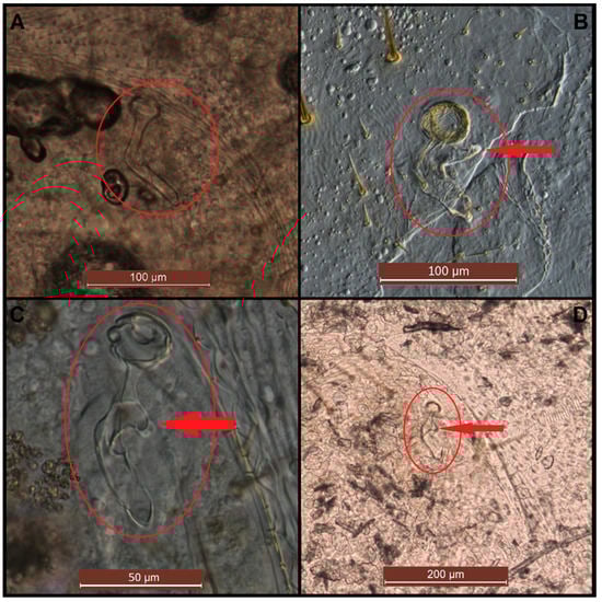 Dissected spiracles (red circles) at various magnifications. (A) Co. formosanus; (B) N. jouteli; (C) C. cavifrons; (D) C. brevis. The red arrows indicate spiracular protuberances (secondary atrial arms).