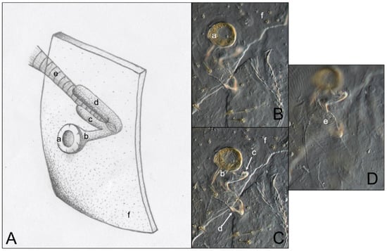 Comparison of an artist’s interpretation and photographs of the attachment of the spiracle structure and the trachea in three kalotermitid species (C. brevis, C. cavifrons, and N. jouteli). (A) Drawing of spiracle-tracheal attachment; (B–D) Photograph illustrating spiracular-tracheal attachment at different focal levels. a: spiracle cap (peritreme); b: atrium; c: atrial arm of spiracle structure; d: additional atrial arm of spiracle structure; e: tracheal trunk; f: cuticle.