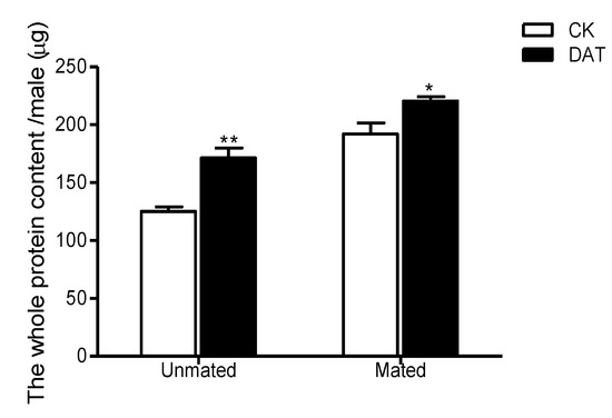 The whole protein content of males was determined in the control (CK) group (at 19 h after emergence) and diallyl trisulfide (DAT) group (treated with 0.01% diallyl trisulfide for 7 h at 12 h after emergence) both before and after mating. The data in the figure are presented as the mean ± SEM. Asterisks depict significant differences relative to the control treatment (*, p < 0.05; **, p < 0.01).