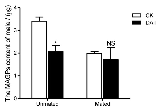 The male accessory gland protein (MAGP) content of males was determined in the CK group (at 19 h after emergence) and DAT group (males treated with 0.01% diallyl trisulfide for 7 h at 12 h after emergence) both before and after mating. The data in the figure are presented as the mean ± SEM. Asterisks depict significant differences relative to the control treatment (NS, no significant difference, *, p < 0.05).
