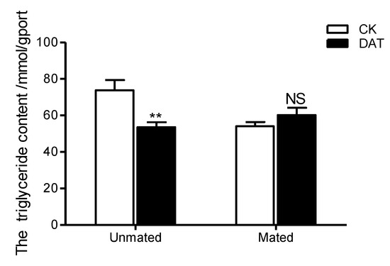 The triglyceride content of males was determined in the CK group (at 19 h after emergence) and DAT group (males treated with 0.01% diallyl trisulfide for 7 h at 12 h after emergence) both before and after mating. The data in the figure are presented as the mean ± SEM. Asterisks depict significant differences relative to the control treatment (NS, no significant difference, **, p < 0.01).