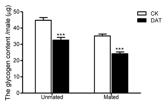 The glycogen content of males was determined in the CK group (at 19 h after emergence) and DAT group (males treated with 0.01% diallyl trisulfide for 7 h at 12 h after emergence) both before and after mating. The data in the figure are presented as the mean ± SEM. Asterisks depict significant differences relative to the control treatment (***, p < 0.001).