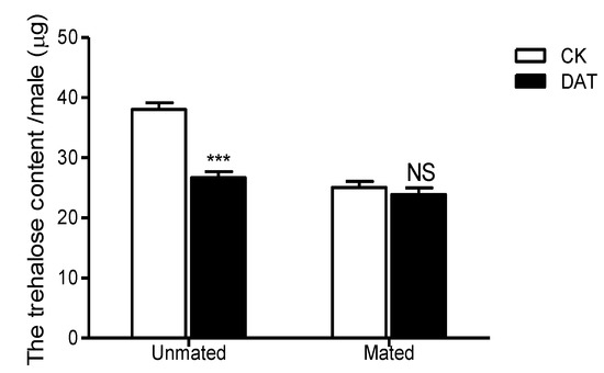 The trehalose content of males was determined in the CK group (at 19 h after emergence) and DAT group (males treated with 0.01% diallyl trisulfide for 7 h at 12 h after emergence) both before and after mating. The data in the figure are presented as the mean ± SEM. Asterisks depict significant differences relative to the control treatment (NS, no significant difference, ***, p < 0.001).