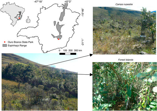 - Coelho, M.S.; Fernandes, G.W.; Pacheco, P.; Diniz, V.; Meireles, A.; dos Santos, R.M.; Negreiros, D. Archipelago of montane forests surrounded by rupestrian grasslands: New insights and perspectives. In Ecology and Conservation of Mountaintop Grasslands in Brazil; Fernandez, G.W., Ed.; Springer: Cham, Switzerland, 2016; pp. 129–156. [Google Scholar]