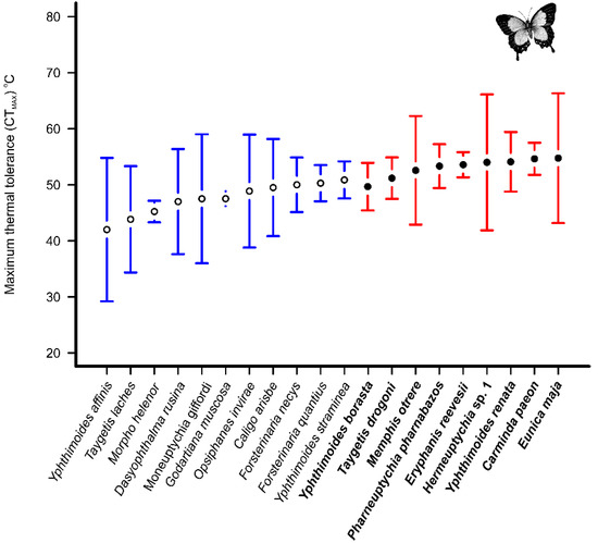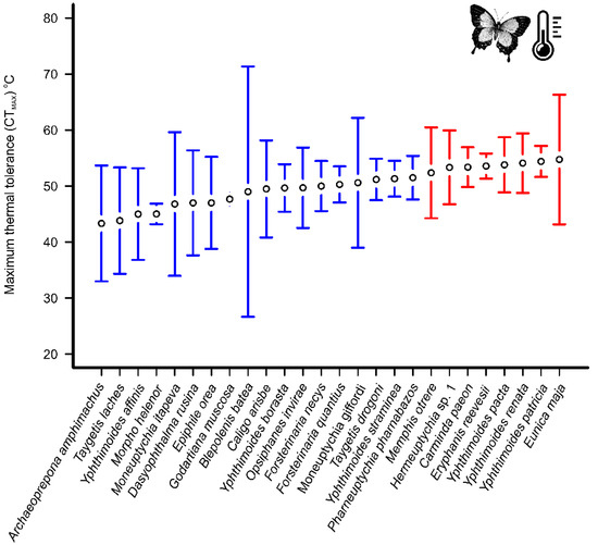 Mean of maximum critical temperature (CTmax) in °C per specimen of fruit-feeding butterflies sampled in the mountaintop environments. Species with higher thermal tolerances are shown in red. The bars represent 95% confidence interval.