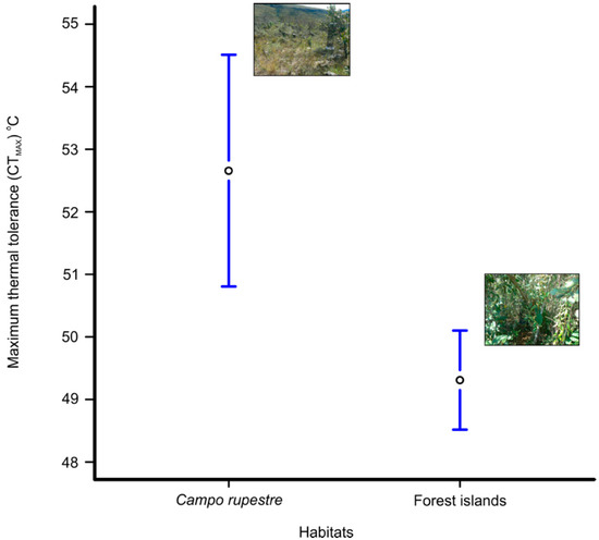 Finally, to evaluate if thermal tolerance in each habitat was similar among the species, we built two generalized linear models (GLMs), one for each habitat (the campo rupestre and the forest islands). We separated all species that were tested at least three times from each habitat. We tested the CTmax (response variable) and the species that occurred in the habitat (explanatory variable). If the models were significant, we did a contrast analysis to determine in how many groups the species were separated and which species belonged to each group. The nature of the data meant that all models presented normal distribution. All analyses were performed in R v 1.1.447 [23].