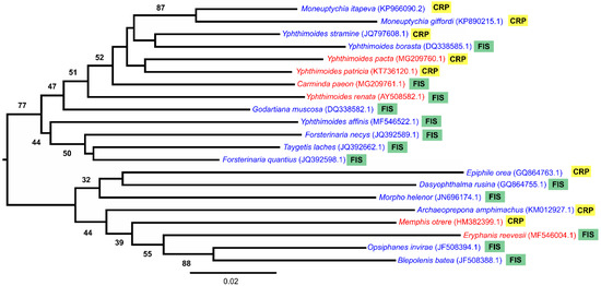 Neighbor joining (NJ) tree showing the phylogenetic relationship of fruit-feeding butterflies with distinct CTmax and habitat occurrence. In red, species with higher thermal tolerance, and in blue, species with lower thermal tolerance, followed by habitat occurrence. CRP = campo rupestre and FIS = forest islands. GenBank accession number inside brackets at tips; numbers above/below branches are bootstrap values.