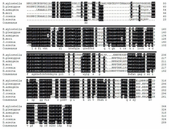 Multiple alignments of Px-fng. The amino acids labeled below represented identical residues in all the species. Lines above the sequences defined the conserved domain of Fringe. The GenBank number of the sequences were: P. xylostella (MK530647.1), D. plexippus (OWR44193.1), H. armigera (XP_021183549.1), B. mori (NP_001116813.1), J. coenia (AAO38754.1), and D. erecta (XP_001973555.1).