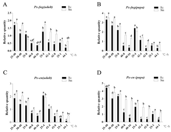 Different heat stress on the expression of Px-fng and Px-en in DBM. Rc: insecticide-resistant DBM, Sm: insecticide-susceptible DBM. Abscissa: temperature (°C)-treated time (h). Ordinate: the relative transcription expression (Mean ± SE) of Px-fng and Px-en, respectively. (A): Effects of heat stress on the expression of Px-fng in adult DBM. (B): Effects of heat stress on the expression of Px-fng in pupa DBM. (C): Effects of heat stress on the expression of Px-en in adult DBM. (D): Effects of heat stress on the expression of Px-en in pupa DBM. Duncan’s test was used for the analysis of the difference between different groups of samples. According to the four groups of experiments designed above (different temperature treatment), each group was analyzed separately, and then these data were integrated into one figure. Therefore, different lowercase letters in the figures represent the statistically significant difference (Duncan’s test, p ≤ 0.05) between each sample in the corresponding groups, and the same letter means that there is no significant difference.