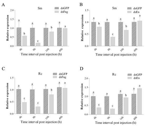 Comparison of Px-fng and Px-en expression levels in Rc-and Sm-pupae by dsFng or dsEn at different times after treatment. (A): Px-fng expression in Sm-pupae by dsFng treatment, (B): Px-en expression in Sm-pupae by dsEn treatment, (C): Px-fng expression in Rc-pupae by dsFng treatment, (D): Px-en expression in Rc-pupae by dsEn treatment. Duncan’s test was used for the analysis of the difference among different groups of samples. Different lowercase letters indicate significant differences in each sample (both Rc and Sm) at different time point after RNA interference (Duncan’s test, p ≤ 0.05). The x-axis indicates the time interval post injection.