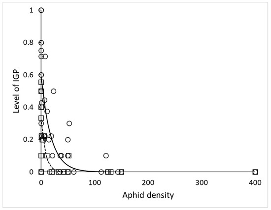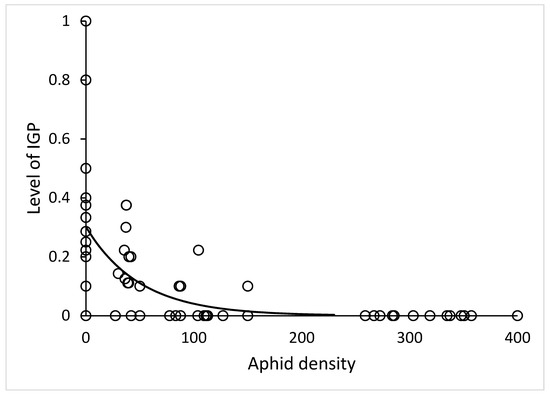 In microcosm set up, time (day of experiment) had no significant effect on IL (χ2 = 1.0, df = 1, p = 0.32). The effect of number of aphids was very strong (χ2 = 38, df = 1, p < 10−6). Neither the stage of lacewing (χ2 = 0.0048, df = 1, p = 0.94) nor the stage of ladybird (χ2 = 0.15, df = 2, p = 0.93) had any effect on IL. The relationship of IL and aphid density (Figure 2) had negative exponential shape IL = a*exp(b*Aphids) with parameters a = 0.30 ± 0.03, b = −0.020 ± 0.006, R2 = 0.41.