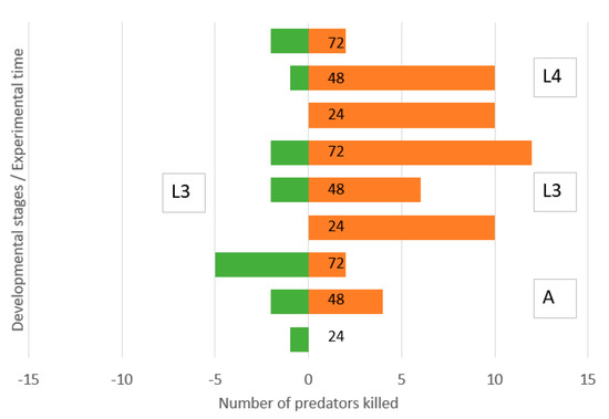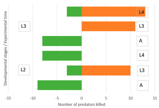 One of the factors known to be responsible for IGP symmetry and direction is body size. Accordingly, larvae of C. septempunctata killed larvae of H. variegata at a higher rate (0.70) than vice versa (0.43) [32]. In our experiments, in the combination of the 2nd instar larvae of C. carnea with the 4th instar larvae of H. variegata, the smaller green lacewing larvae were the intraguild prey. The opposite situation appeared between the 3rd instars: the 3rd instar lacewing larvae were almost 1.5 times as great as that of the 3rd ladybird larvae, and there were also mobility differences. For an equivalent predator size, the lacewings won the contest with ladybird larvae in several studies [10,19,21]. In our previous study, we have shown prevalent IGP dominance of L3 larvae of C. carnea over much bigger L4 larvae of ladybird H. axyridis [12].