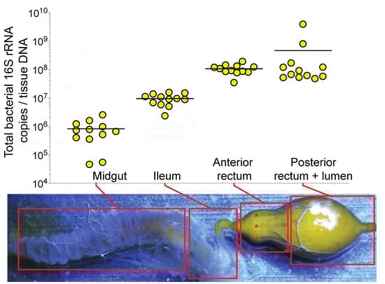 All experiments were conducted in July 2018 at the USDA-ARS Carl Hayden Honey Bee Research Center Tucson, Arizona, USA. Nurse-aged bees were obtained from the center of the brood nest from 12 healthy colonies. Bees were held by the thorax with sterile forceps in one hand, and an abdominal sternite was grasped with a second pair of forceps to facilitate removal of the entire digestive tract from the abdomen. From each of 12 colonies, 12 pollen-containing “nurse” guts per colony were sectioned according to the scheme outlined in Figure 1 and pooled into the following tissue types: midgut, ileum, anterior rectum, posterior rectum + lumen contents. For sectioning of the rectum, the anterior portion of the rectum (including host rectal pads, marked with an asterisk in Figure 1) was held with forceps in one hand, and the rectum was held over a sample tube and cut with microscissors to catch the posterior portion plus lumen contents (see Figure 1), then the anterior portion was added to a separate collection tube. Samples, therefore, consisted of 12 colony replicates of 12 pooled guts for each of 4 tissue types. Anterior rectum tissues were washed with 500 μl of sterile dH2O in a microcentrifuge tube by vortexing to remove lumen contamination. The samples were pelleted by centrifugation then the supernatant was carefully removed and discarded, leaving behind the washed anterior rectum tissues. This was repeated three times to facilitate the removal of lumen bacterial signal. Samples were transferred to 2-ml bead-beating tubes containing 0.2 g of 0.1-mm silica beads and DNA was extracted using an AllPrep PowerViral DNA/RNA Kit (Qiagen, Hilden, Germany) according to the manufacturer’s instructions. Total bacterial abundance was estimated by qPCR using universal bacterial 16S rRNA gene copies and a standard curve generated from a 10-fold serial dilution series of a plasmid DNA containing a full-length Escheria coli 16S rRNA gene. The qPCR results were expressed as the total number of 16S rRNA gene copies per tissue sample by multiplying by the total DNA concentration in each sample [40].