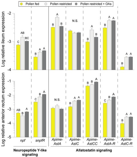- Ament, S.A.; Velarde, R.A.; Kolodkin, M.H.; Moyse, D.; Robinson, G.E. Neuropeptide Y-like signalling and nutritionally mediated gene expression and behaviour in the honey bee. Insect Mol. Biol. 2011, 20, 335–345. [Google Scholar] [CrossRef]