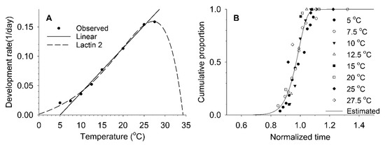 Observed values of development rates at constant temperatures and estimated linear (Equation (1)) and nonlinear Lactin-2 model (Equation (2)) curves between temperature and development rates (A), and Weibull distribution curve (Equation (3)) for development completion (B) in A. solani nymphs.