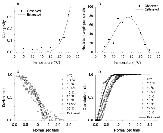 Aging rate increased exponentially with increasing temperature, and its generalized model (Equation (4)) achieved a high radj2 value of 0.88 (Table 5 and Figure 2). However, the model underestimated observed aging rates between 5 and 20 °C. The total fecundity model (Equation (5)) achieved an radj2 value of 0.74, and estimated that the maximum fecundity of this species on soybean is ca. 76.9 nymphs per adult at an optimum temperature of 18.1 °C. Survival (Equation (6)) and cumulative fecundity (Equation (3)) models applied to the normalized ages of adults fit the observed values well, with high radj2 values.