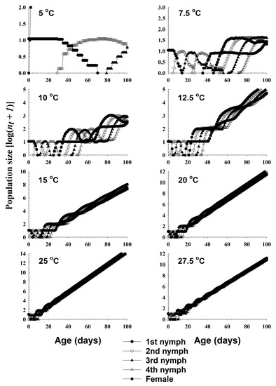 Life tables were constructed using the methods described by Jandricic et al. [20], Birch [35] and Southwood and Henderson [36]. Data for the survival, birth, and development of individuals from the neonate nymph stage to death at eight different temperatures between 5 and 27.5 °C were collected. The age-specific survival rate (lx) (Equation (9)) and the survival rate (sxj) were defined to be the probability that a newly born individual would survive to age x and stage j, respectively. The sxj provides the beginning age x of the survival curve of stage j, last age x of the survival curve of stage j, mortality of stage j, and death age of individuals that died in stage j. The death, the beginning, and end of a stage can be provided.