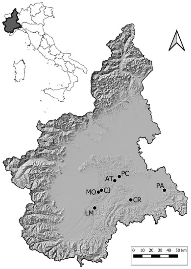 Location of the seven experimental sites within the Piedmont Region of Italy. AT, Asti; CI, Cisterna d’Asti; CR, Castel Rocchero; LM, La Morra; MO, Montà d’Alba; PA, Paderna; PC, Portacomaro.